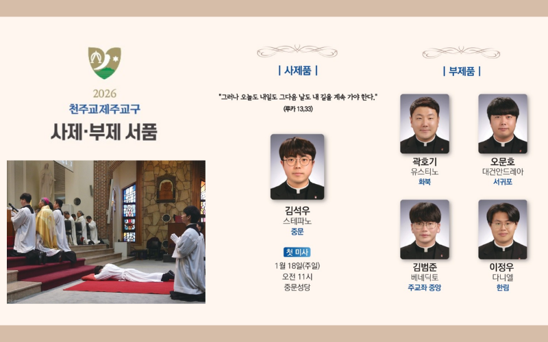 김석우 스테파노 사제 서품 및 첫 미사 안내 중문성당 0 536 01.12 13:40 김석우 스테파노 사제 서품 및 첫 미사 안내"그러나 오늘도 내일도 그다음 날도 내 길을 계속 가야 한다."(루카 13,33) 찬미 예수님, 우리 중문성당 공동체의 큰 기쁨인 김석우 스테파노 부제님의 사제 서품식과 관련 일정을 아래와 같이 안내드립니다. 새 사제의 탄생을 위해 신자 여러분의 많은 기도와 참여를 부탁드립니다.1. 사제 서품식 및 참여 안내일시: 1월 17일(토) 오후 2시장소: 삼위일체 대성당 (주례 : 교구장 문창우 주교)단체 이동 버스: 오후 12시 00분 천제연 주차장 출발 (예약자 120명)2. 새 사제 안수 및 저녁 식사일시: 1월 17일(토) 오후 5시장소: 중문성당안수식에 참여하시는 분들을 위해 정성껏 저녁 식사를 준비하였습니다.3. 새 사제 첫 미사일시: 1월 18일(주일) 오전 11시장소: 중문성당공지: 당일 주차는 가급적 천제연 주차장을 이용해 주시기 바랍니다.안내: 오후 5시 가족미사는 없습니다.4. 새 사제 축하식일시: 1월 18일(주일) 오후 1시 ~ 5시장소: 상예 1 다목적회관 (상예로 77 / 상예동 1526-1)새로운 목자의 길을 걷게 될 김석우 스테파노 부제님을 위해 마음을 모아 주세요.중문성당 신자 일동 </</</