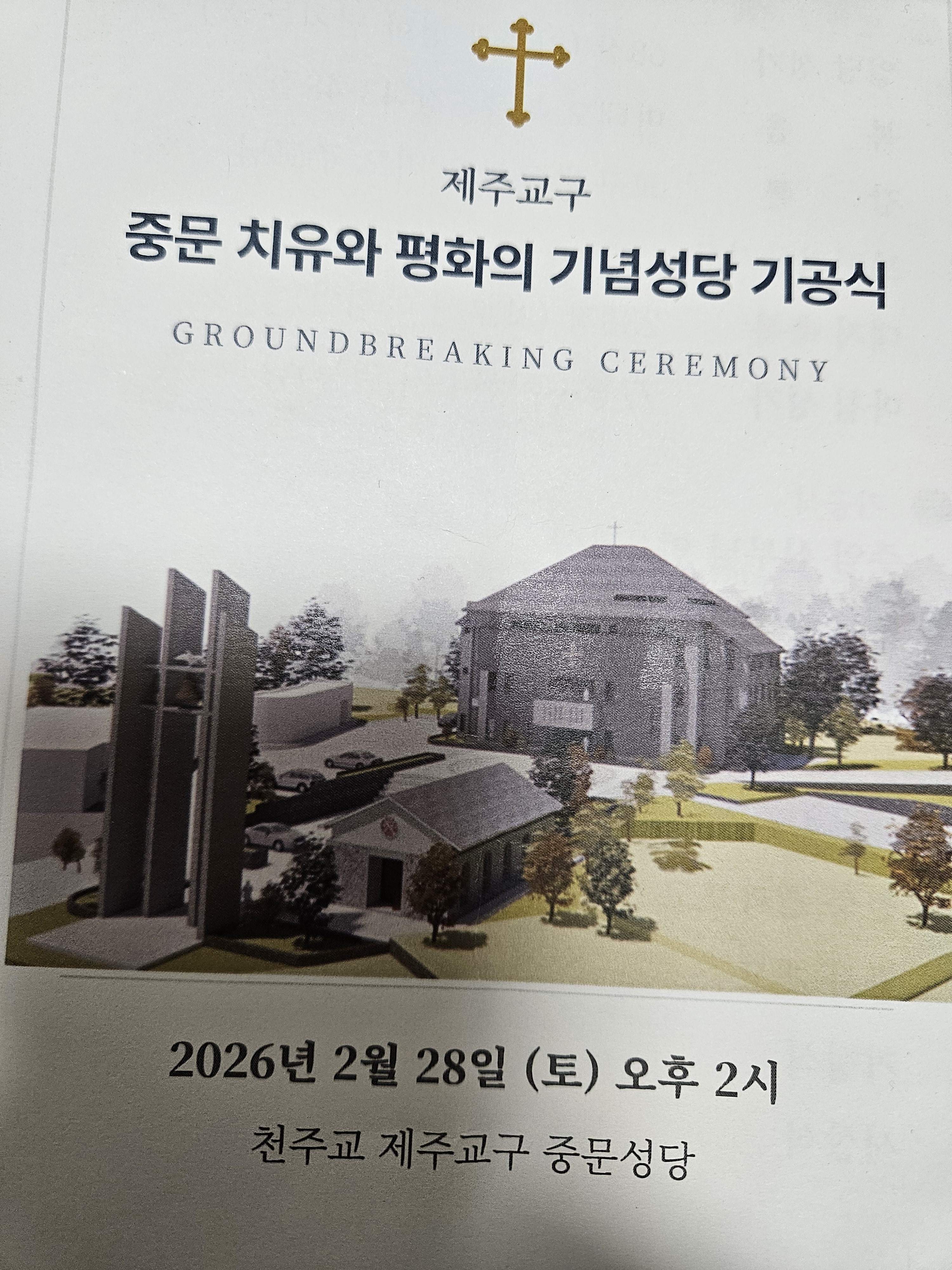 *** 중문 치유와 평화의 기념성당 기공식 *** 미카엘 2 37 02.28 23:09 “치유와 평화의 기념성당 기공식”4.3으로 인하여 옛 중문면 전체 희생자는 786명입니다.이중 평화와 치유의 기념성당이 들어서는 이곳에서는 71위가 처형당한 곳입니다.오늘 치유와 평화의 기념성당 기공식에오영훈 제주도지사님김한규 국회의원님이상봉 도의회의장님김창범 4.3유족회장님 등 도단위 기관장 및 단체장, 일반인과 천주교 신자 등이 대거 참석했습니다. 주례는 문창우 비오 주교님께서 집전하시고, 교구 내 신부들님께서도 많이 참석하셨습니다. 일제강점기에는 신사를 지어놓고 학생들과 일반인들로 하여금 참배를 강요 당하기도 했던 땅입니다.역사적으로 버림받은 땅, 억울하게 희생당한 혼백이 득실거리는 곳으로 아침에 소를 매어 두었다가 해가 지면 소 몰려가기를 꺼렸던 의시시한 곳 이였다고 전해집니다.그런 곳에 용서와 화해의 성전이 들어서는 것입니다.김성훈 전 사목회장의 경과보고를 경청하던 중 하느님의 뜻이 아니고는 이루어질 수 없을 것 같은 생각이 들었습니다.중학교 교문 맞은 편에 있던 공소를 보건지소에 넘기고 지금의 본당으로 옮겨온 일, 보건지소가 다시 지금 성당 옆으로 이사를 오는 일이 일어났습니다. 성당과 보건지소는 땔 라야 땔 수 없는 인연이 있나 봅니다. 이젠 보건지소가 4,3 기념관으로 변신 하고 보건지소는 구 동사무소 건물로 옮겨갔습니다. 보건지소와 공소가 싸고도는 일련의 일들이 사람의 머리로는 불가능한 주님의 뜻이었다는 생각이 스쳤습니다. 이뿐만이 아닙니다. 본당과 전연 연고가 없는 황창연 신부님께서 사제관과 화장실을 지어주시더니 급기야는 성전신축 기금으로 거금을 지원하면서 우리들도 성전 건축에 희망을 갖게 된 것입니다. 고병수 사도요한 신부님이 부임, 전국을 누비며 모금활동에 돌입하면서 가능성을 갖게 된 것입니다. 이런 일들이 없었다면 조그마한 성당에서 수십억 원이 소요되는 성전건축을 상상도 못했을 것입니다. 성전 신축은 하느님의 뜻입니다. 다시는 이땅에 4.3과 같은 비극이 일어나지 않도록 ‘치유’와 ‘평화’의 성전을 주신 것입니다. . --2026, 2, 28--